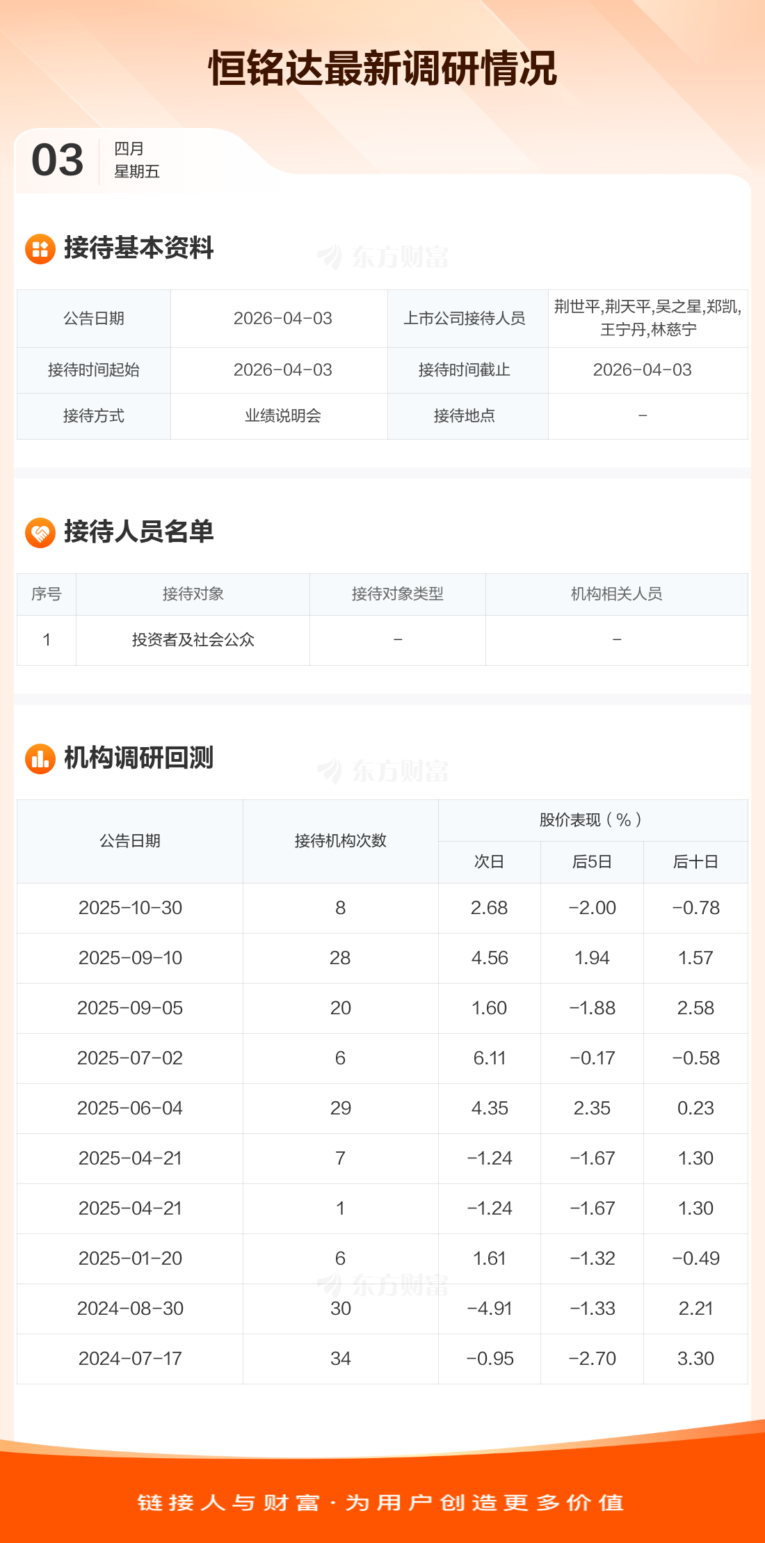 恒铭达4月3日公告称,4月3日接待投资者及社会公众等1家机构调研。接待人员包括荆世平,荆天平,吴之星,郑凯,王宁丹,林慈宁。
