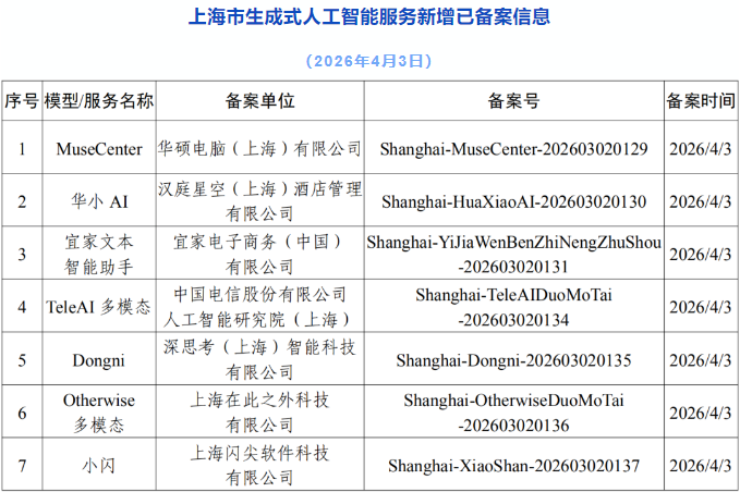 人民财讯4月3日电,据“网信上海”消息,截至4月3日,上海市新增7款已完成备案的生成式人工智能服务,累计已完成157款生成式人工智能服务备案。
