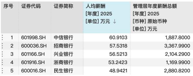 其中,中信银行以超60万元的人均薪酬水平暂居上市银行首位。Wind数据显示,中信银行2025年人均薪酬达到60.91万元,且这一数据较2024年的60.14万元小幅上涨;招行则以57.53万元紧随其后,相较于2024年,人均减少约7200元。