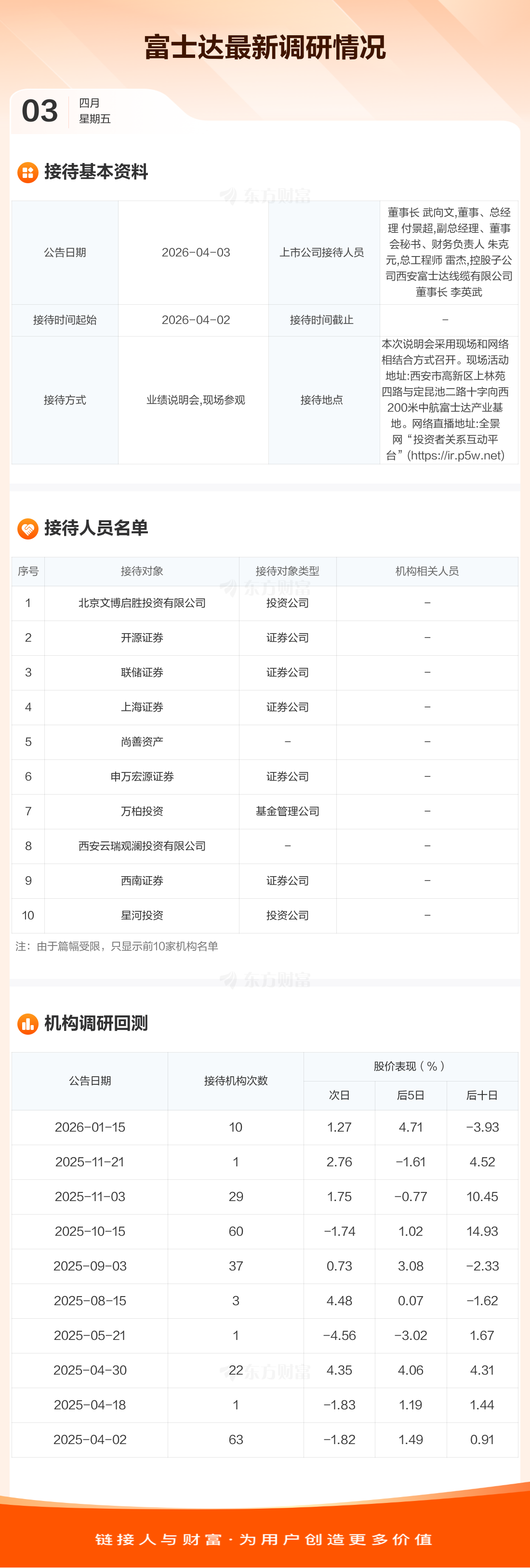 富士达4月3日公告称,4月2日接待北京文博启胜投资有限公司等37家机构调研。接待人员包括董事长 武向文,董事、总经理 付景超,副总经理、董事会秘书、财务负责人 朱克元,总工程师 雷杰,控股子公司西安富士达线缆有限公司董事长 李英武。