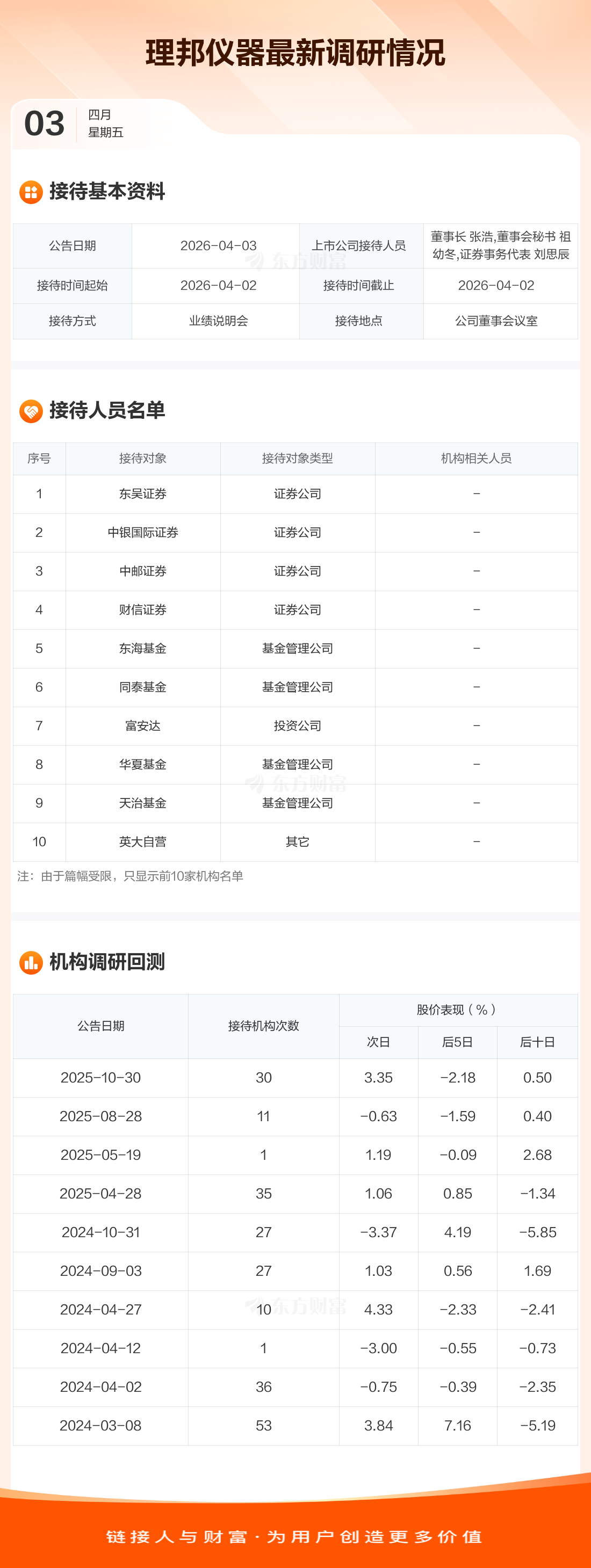 理邦仪器4月3日公告称,4月2日接待东吴证券等32家机构调研。接待人员包括董事长 张浩,董事会秘书 祖幼冬,证券事务代表 刘思辰。