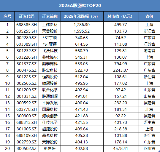 Wind数据显示,2025年A股涨幅前20股票分别为上纬新材、天普股份、*ST宇顺、*ST亚振、飞沃科技、菲林格尔、鼎泰高科、胜宏科技、恒勃股份、顺灏股份、联合化学、胜通能源、平潭发展、国晟科技、海峡创新、仕佳光子、超捷股份、品茗科技、天际股份、新易盛。