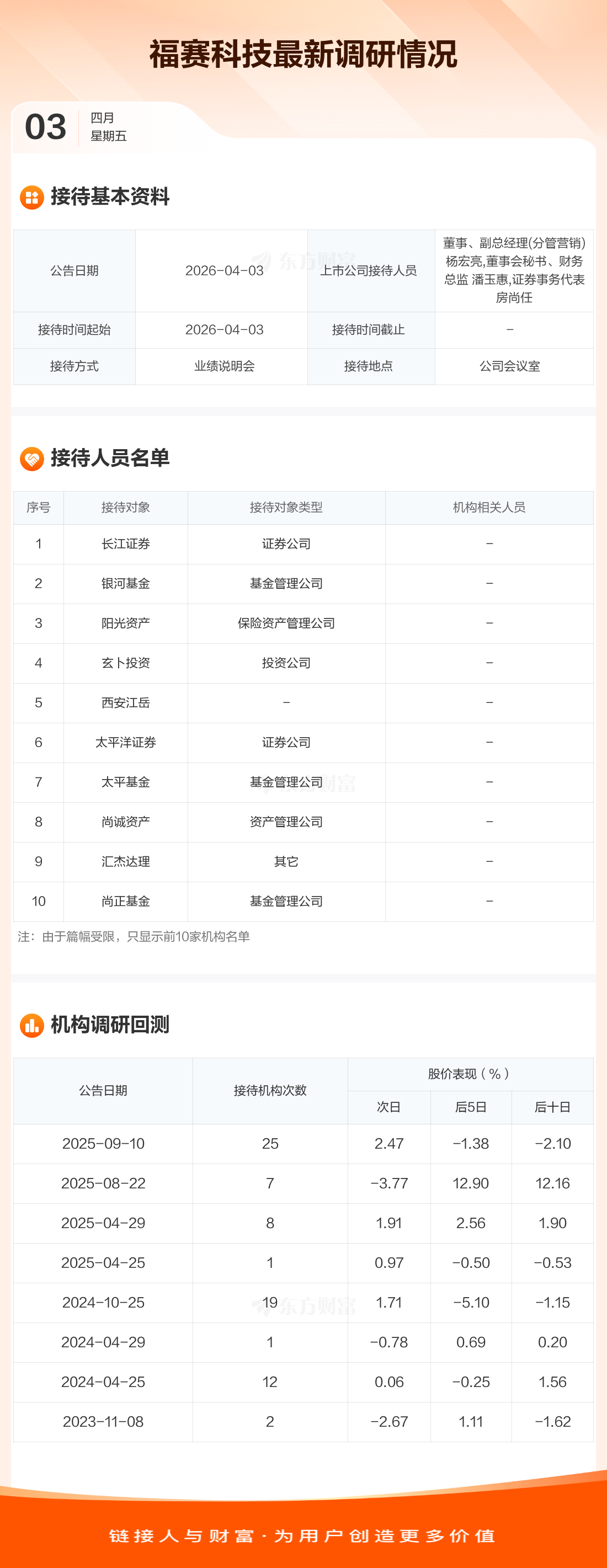 福赛科技4月3日公告称,4月3日接待长江证券等67家机构调研。接待人员包括董事、副总经理(分管营销) 杨宏亮,董事会秘书、财务总监 潘玉惠,证券事务代表 房尚任。