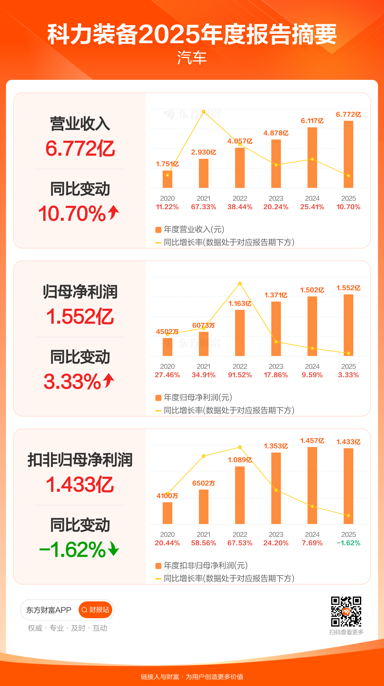 科力装备4月4日发布2025年年报显示,公司全年实现营业收入6.77亿元,同比增长10.70%;归母净利润1.55亿元,同比增长3.33%;扣非归母净利润1.43亿元,同比下滑1.62%。