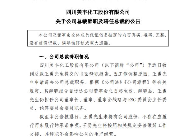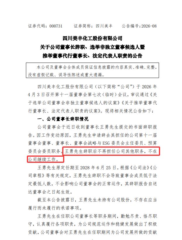 距离2025年年报披露不足一个月,四川美丰化工股份有限公司(000731.SZ,以下简称“四川美丰”)突现高层变动。公司4月3日晚间公告,董事长王勇因工作变动辞去全部职务,彻底退出公司。
