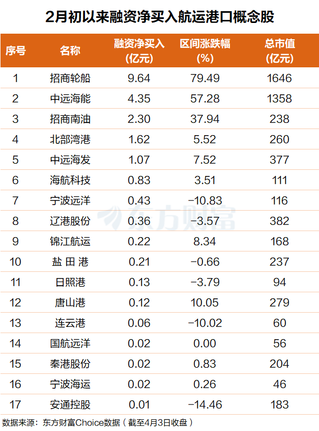 东方财富Choice数据显示,自今年2月初以来,杠杆资金抢筹了17只航运港口概念股。具体来看,招商轮船排名第一,融资净买入9.6亿元;中远海能排名第二,融资净买入4.4亿元。