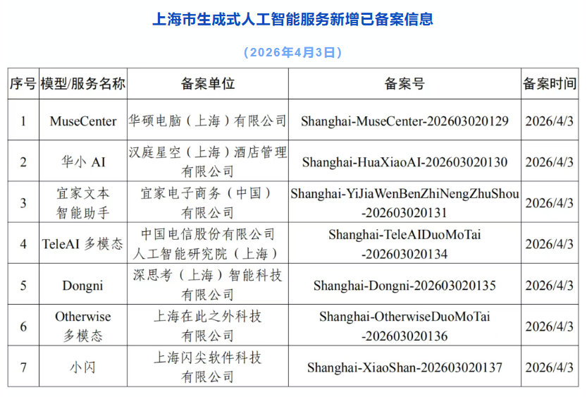 上证报中国证券网讯据上海市网信办4月3日消息,截至4月3日,上海市新增7款已完成备案的生成式人工智能服务,累计已完成157款生成式人工智能服务备案。