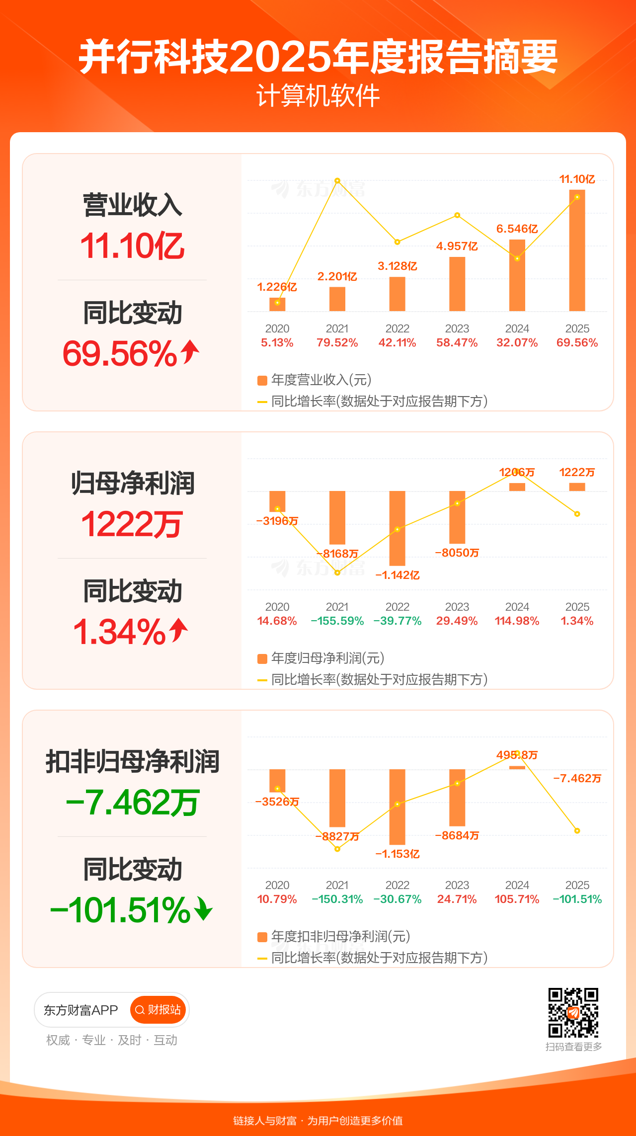 并行科技4月3日发布2025年年报显示,公司全年实现营业收入11.10亿元,同比增长69.56%;归母净利润1221.80万元,同比增长1.34%;扣非归母净利润-7.46万元。