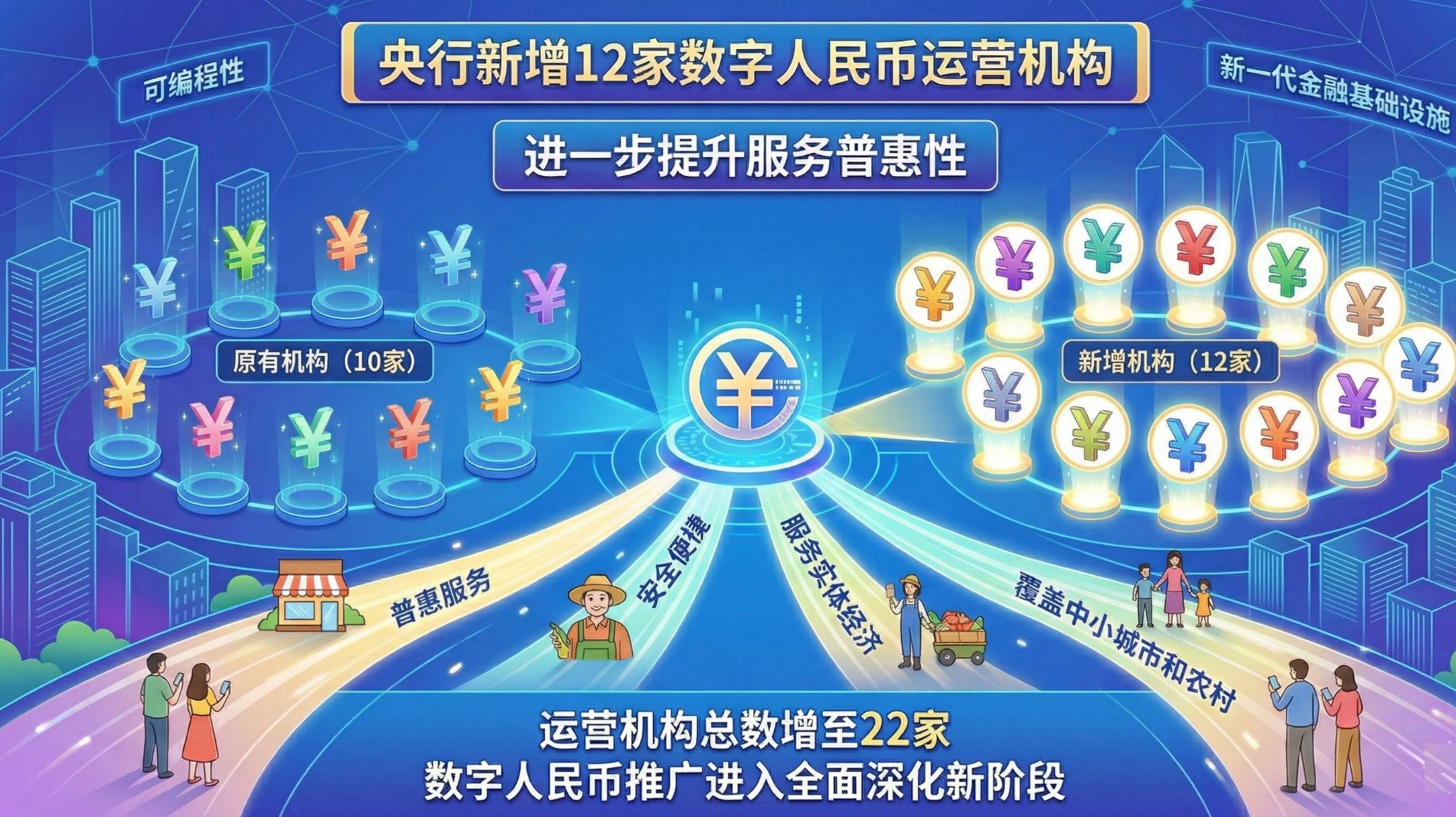 此前,数字人民币业务运营机构包括工商银行、农业银行、中国银行、建设银行、交通银行、邮政储蓄银行、招商银行、兴业银行、微众银行和网商银行共10家。此次扩容后,运营机构总数增至22家。