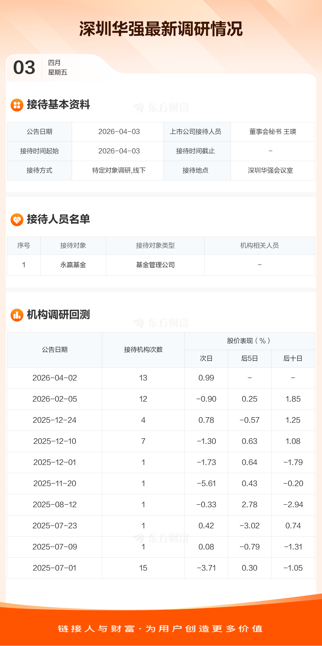 深圳华强4月3日公告称,4月3日接待永赢基金等1家机构调研。接待人员包括董事会秘书 王瑛。