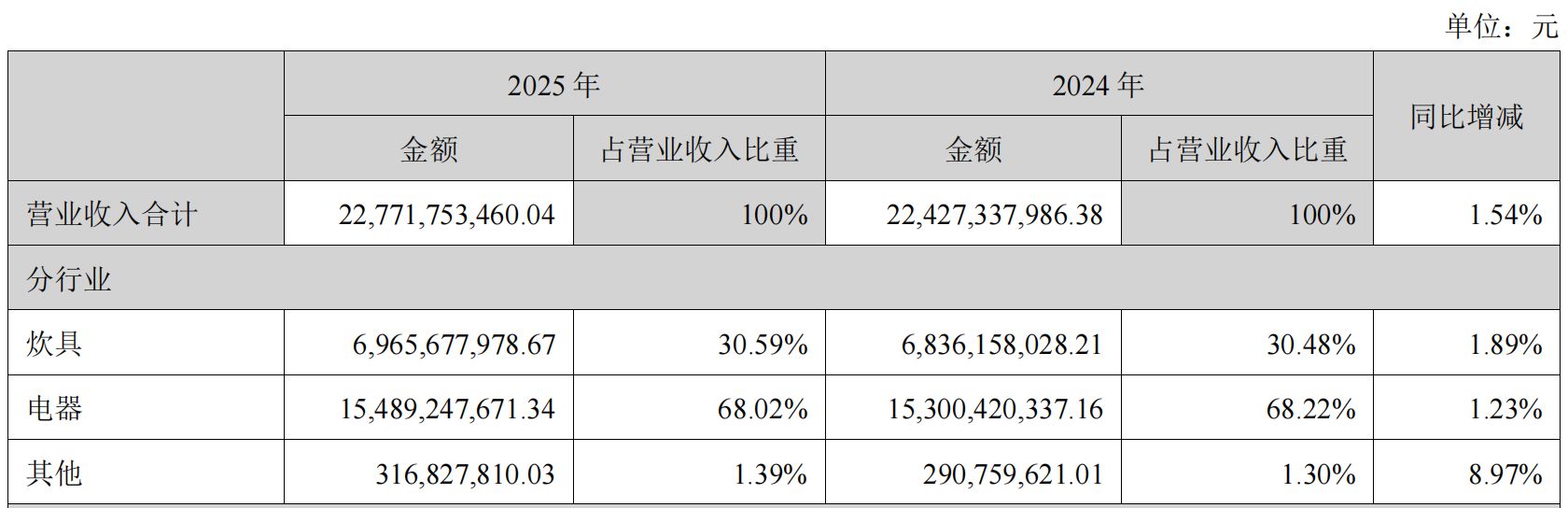 从业务结构看,2025年苏泊尔的主要营收来自电器和炊具业务。其中炊具业务收入约69.66亿元,同比增长1.89%;电器业务收入约154.89亿元,同比增长1.23%。按区域划分,内销主营业务收入约151.66亿元,同比增长2.77%,仍是主要支撑;外贸主营业务收入约73.38亿元,同比下降0.98%。