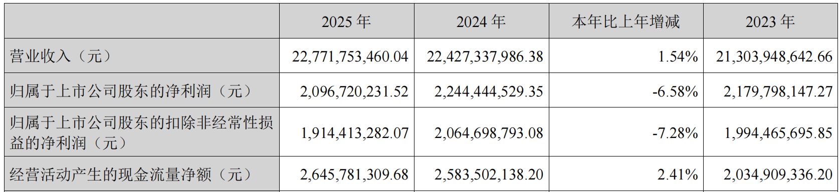 4月2日晚间,小家电龙头苏泊尔(SZ002032,股价45.96元,市值368.46亿元)发布2025年年度报告,公司全年实现营业收入约227.72亿元,同比增长1.54%;归属于上市公司股东的净利润约20.97亿元,同比下降6.58%;扣非归母净利润约19.14亿元,同比下降7.28%。