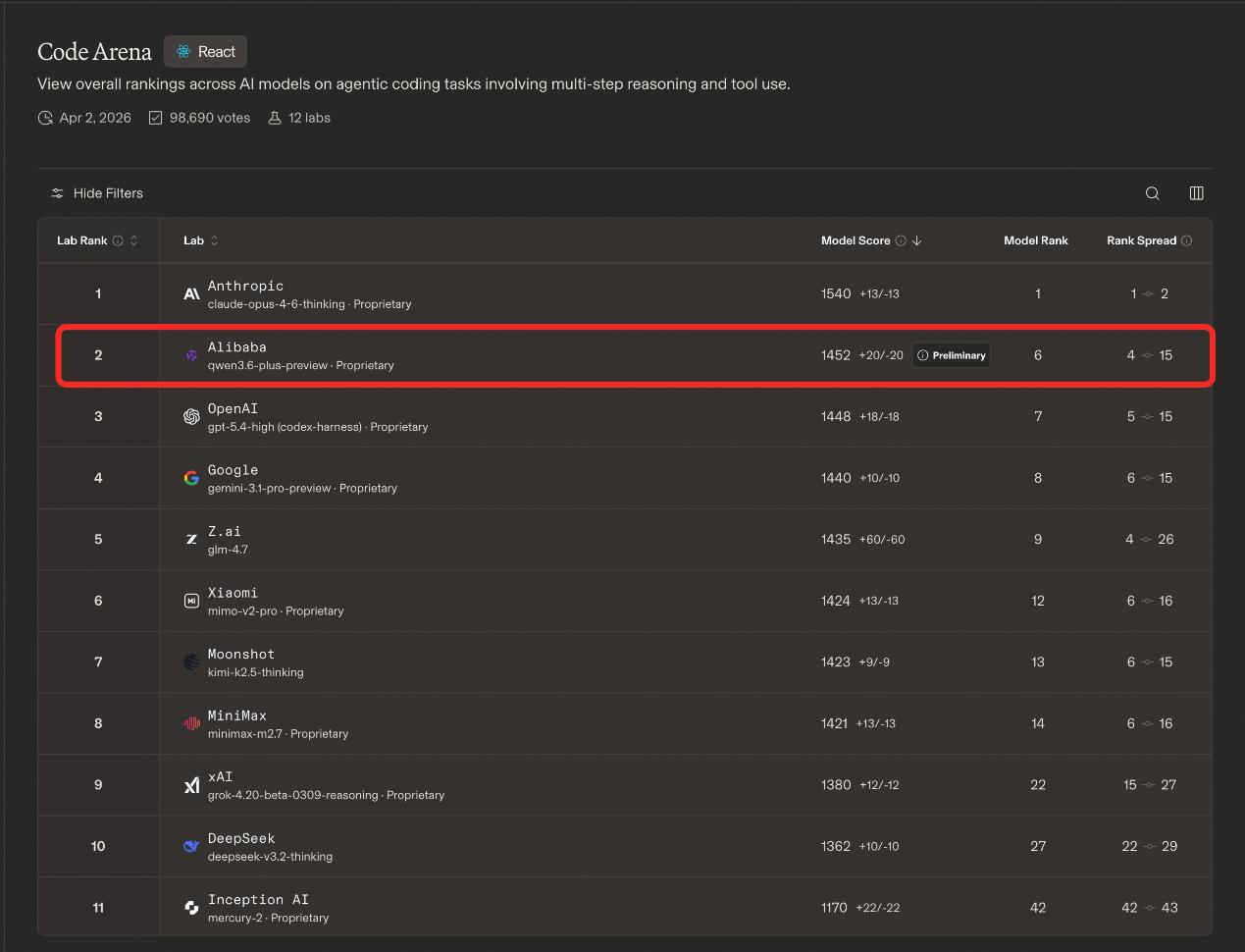 4月3日,大模型盲测榜单LMArena旗下聚焦AI编程能力的Code Arena公布新一期排名,阿里巴巴最新一代大语言模型Qwen 3.6-Plus登上全球榜单第二,超越OpenAI、Google、xAI等模型,成为该榜单上排名最高的中国大模型。