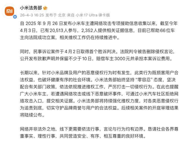 小米法务部:已帮助66位车主向法院成功立案 民事诉讼案取得首个胜诉判决