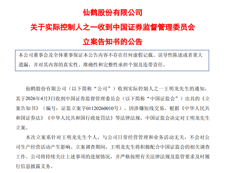 4月3日晚,仙鹤股份公告称,公司实际控制人之一王明龙收到浙江证监局行政监管措施决定书、证监会立案告知书。