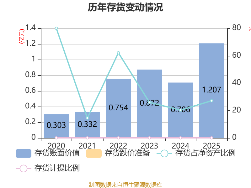 从存货变动来看,截至2025年末,公司存货账面价值为1.21亿元,占净资产的27.09%,较上年末增加5006.18万元。公司本期没有计提存货跌价准备。