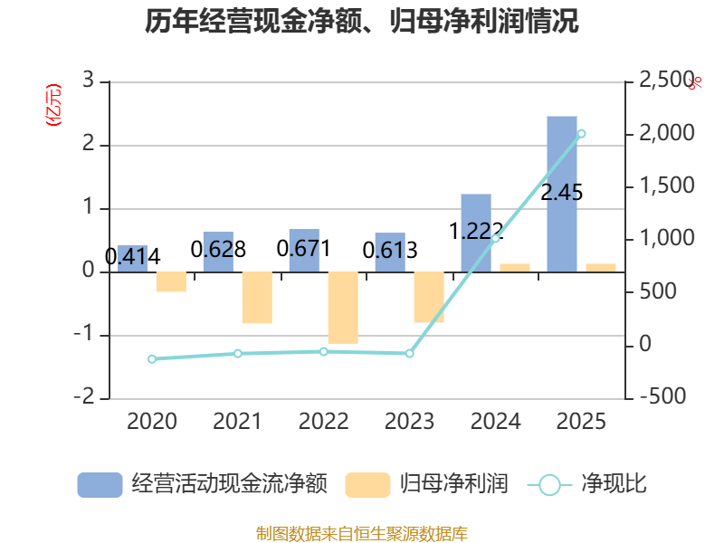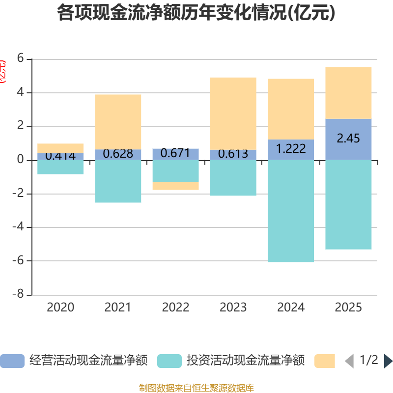 截至2025年,公司经营活动现金流净额为2.45亿元,同比增长100.46%;筹资活动现金流净额3.07亿元,同比减少5261.8万元;投资活动现金流净额-5.31亿元,上年同期为-6.06亿元。