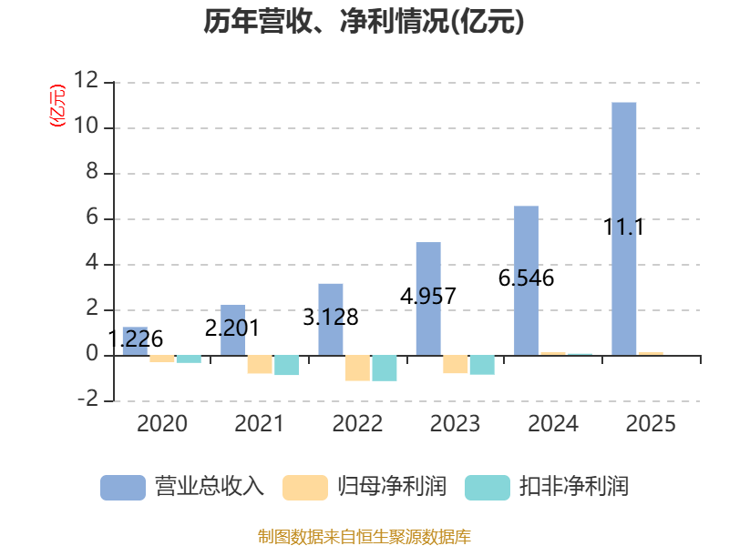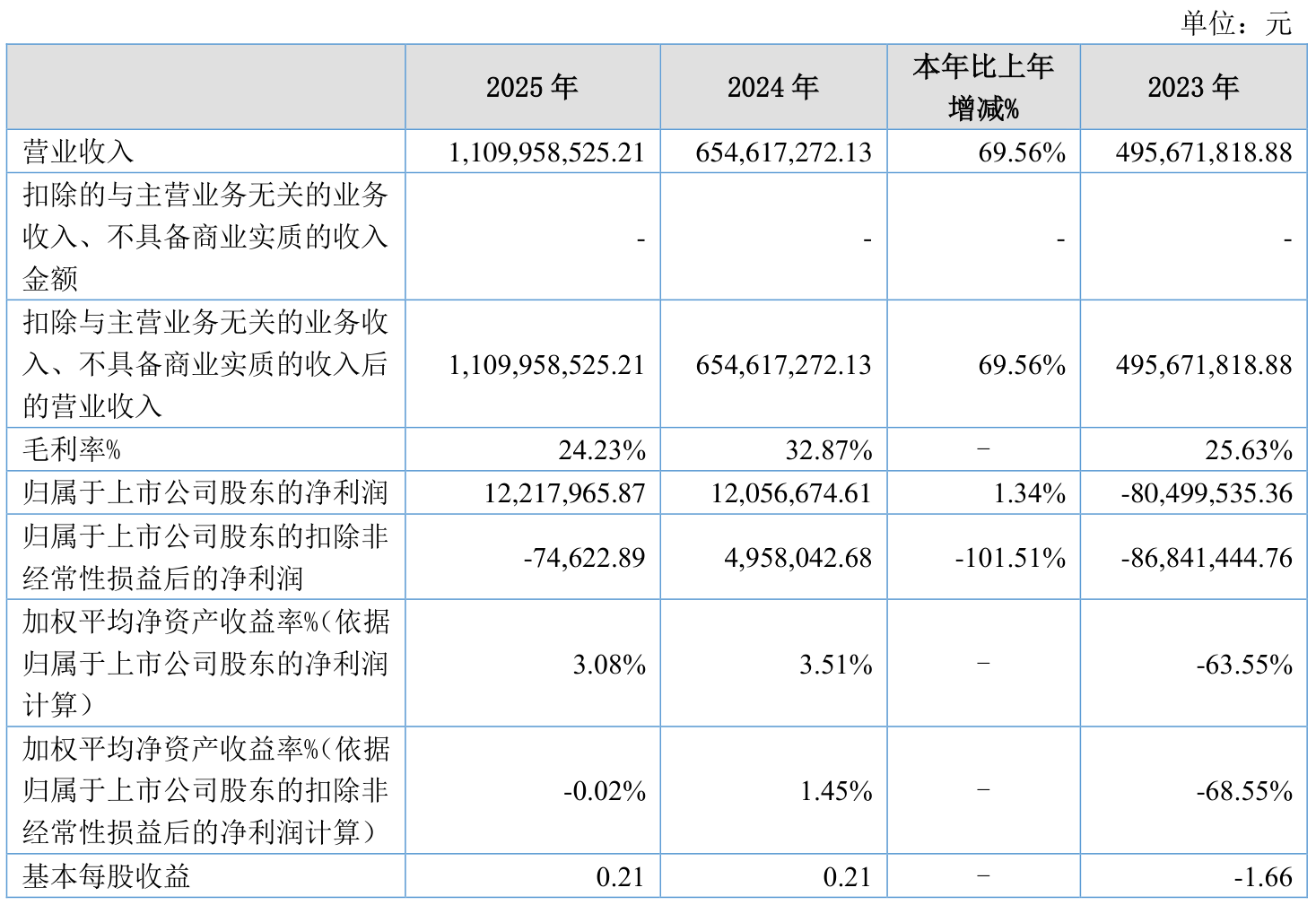 中证智能财讯并行科技(920493)4月3日披露2025年年度报告。2025年,公司实现营业总收入11.1亿元,同比增长69.56%;归母净利润1221.8万元,同比增长1.34%;扣非净利润亏损7.46万元,上年同期盈利495.8万元;经营活动产生的现金流量净额为2.45亿元,同比增长100.46%;报告期内,并行科技基本每股收益为0.21元,加权平均净资产收益率为3.08%。