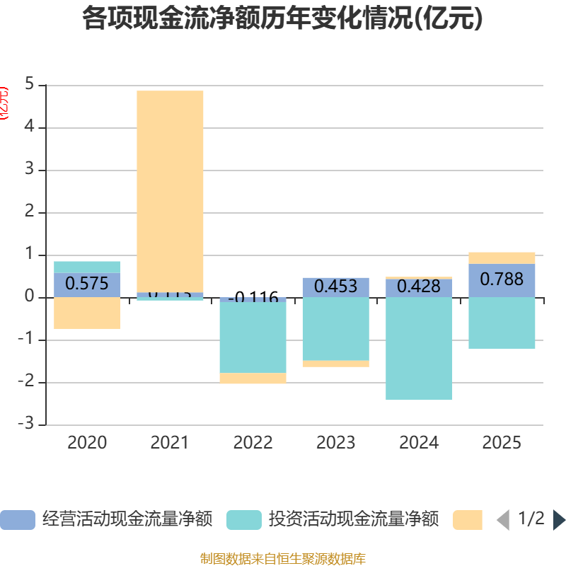 截至2025年,公司经营活动现金流净额为7879.04万元,同比增长84.26%;筹资活动现金流净额2679.77万元,同比增加2153.24万元;投资活动现金流净额-1.22亿元,上年同期为-2.42亿元。