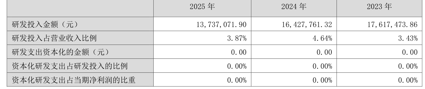 2025年全年,公司研发投入金额为1373.71万元,同比下降16.38%;研发投入占营业收入比例为3.87%,相比上年同期下降0.77个百分点。此外,公司全年研发投入资本化率为0%。