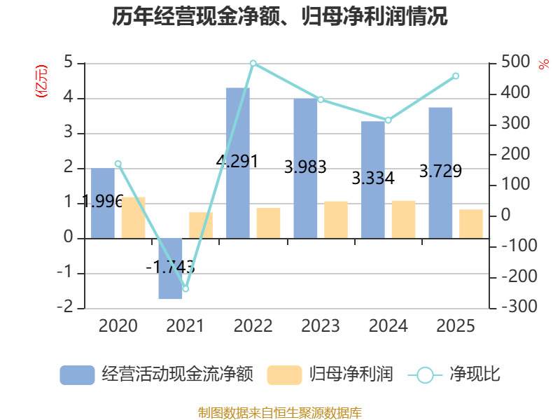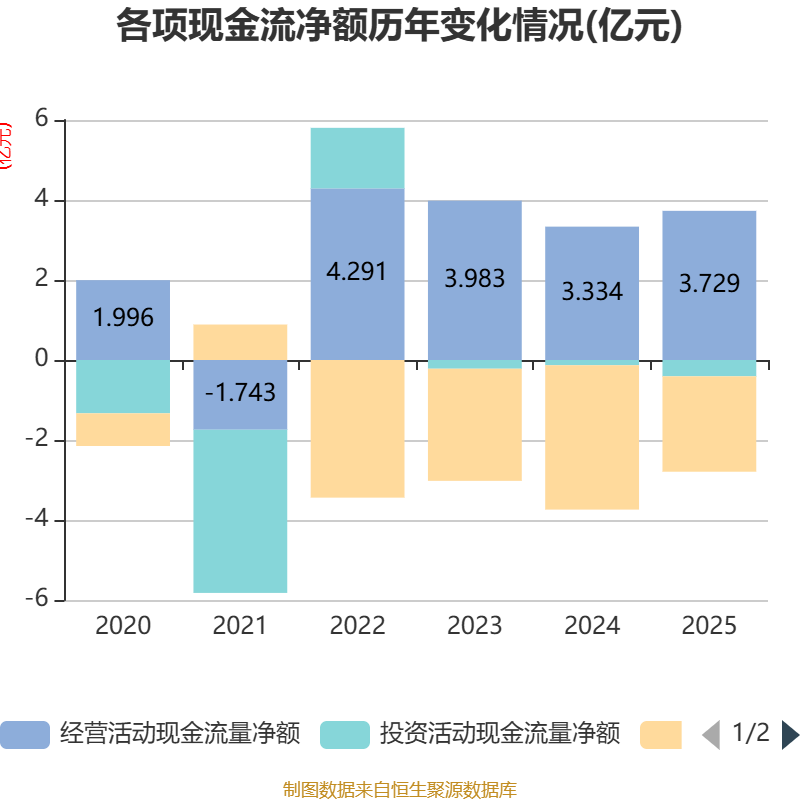 截至2025年,公司经营活动现金流净额为3.73亿元,同比增长11.83%;筹资活动现金流净额-2.39亿元,同比增加1.22亿元;投资活动现金流净额-4075.74万元,上年同期为-1311.53万元。