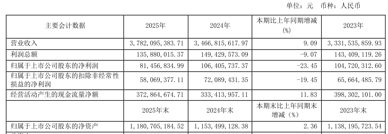 中证智能财讯爱婴室(603214)4月4日披露2025年年度报告。2025年,公司实现营业总收入37.82亿元,同比增长9.09%;归母净利润8145.68万元,同比下降23.45%;扣非净利润5806.94万元,同比下降19.45%;经营活动产生的现金流量净额为3.73亿元,同比增长11.83%;报告期内,爱婴室基本每股收益为0.588元,加权平均净资产收益率为10.34%。公司2025年度分配预案为:拟向全体股东每10股派现2.53元(含税)。
