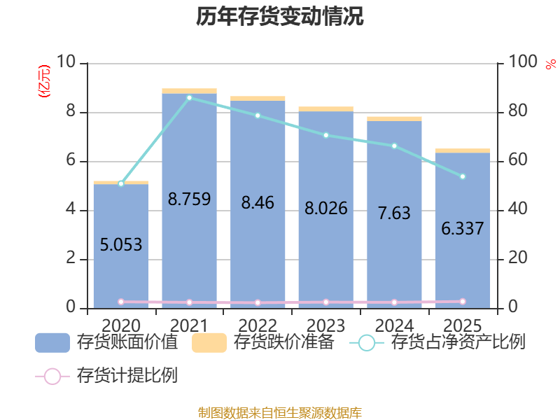 从存货变动来看,截至2025年末,公司存货账面价值为6.34亿元,占净资产的53.67%,较上年末减少1.29亿元。其中,存货跌价准备为1730.27万元,计提比例为2.66%。