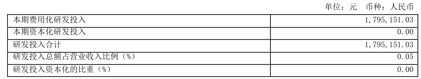 2025年全年,公司研发投入金额为179.52万元;研发投入占营业收入比例为0.05%。此外,公司全年研发投入资本化率为0%。