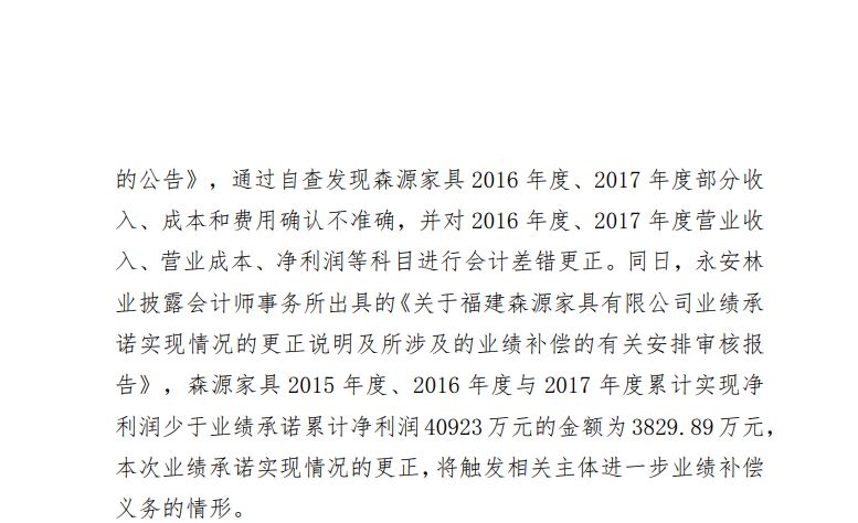 但这份业绩承诺最终沦为空谈。2019年,永安林业通过自查发现,森源家具在2016年度、2017年度的部分收入、成本和费用确认存在不准确的情况,随后对这两年的营业收入、营业成本、净利润等核心会计科目进行了差错更正。经更正核算,森源家具在2015年度、2016年度、2017年度累计实现的净利润,实际上少于其承诺的累计净利润40923万元,最终的差额(即未完成金额)高达3829.89万元。这一重大会计差错更正,直接触发了相关主体进一步履行业绩补偿义务的情形。