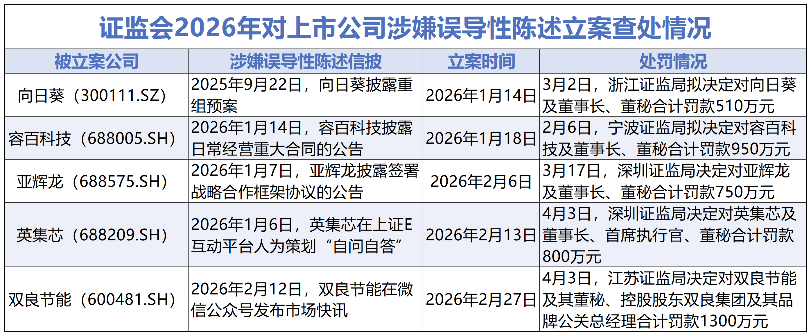 此前,因涉误导性陈述,向日葵、容百科技、亚辉龙也已被证监部门作出行政处罚决定或事先告知,合计罚款金额达2210万元。