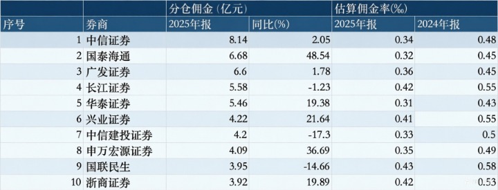 首先,头部阵营内的“座次之争”愈发激烈。2025年,中信证券以8.14亿元稳居行业首位,继续保持领先优势。完成合并的国泰海通,其全年分仓佣金收入同比增长48.5%至6.68亿元,排名升至行业第二。而广发证券、长江证券的行业排名则分别由2024年的第二、第三,依次退至第三、第四。