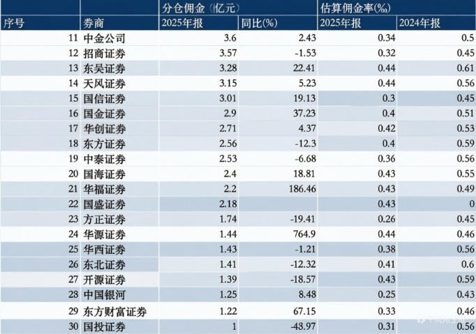 国金证券、华福证券的排名亦有明显上升。这两家券商2025年的佣金收入分别为2.9亿元、2.2亿元;同比增幅分别达到37%、186%。由此,国金证券的排名由2024年的第21位升至第16位;华福证券的排名由第33位上升到第21位。