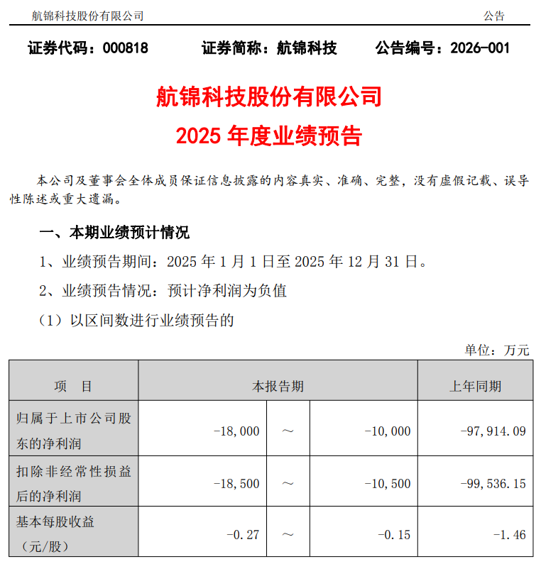 1月31日,航锦科技发布业绩预告称,公司预计2025年的归母净利润为-1.8亿元至-1亿元,扣非后净利润为-1.85亿元至-1.05亿元。