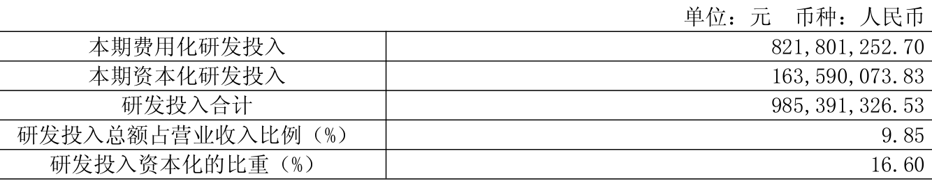 2025年全年,公司研发投入金额为9.85亿元,同比增长5.44%;研发投入占营业收入比例为9.85%,相比上年同期下降3.43个百分点。此外,公司全年研发投入资本化率为16.6%。