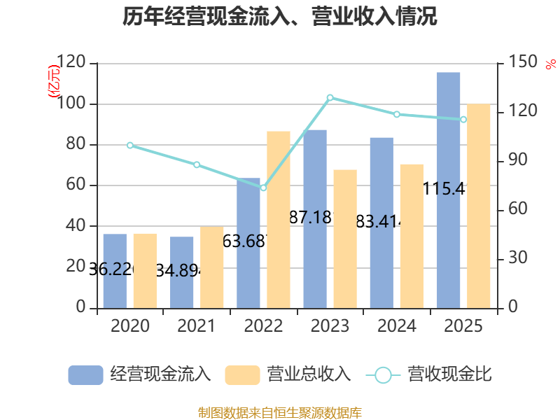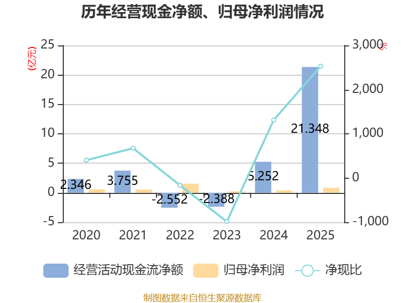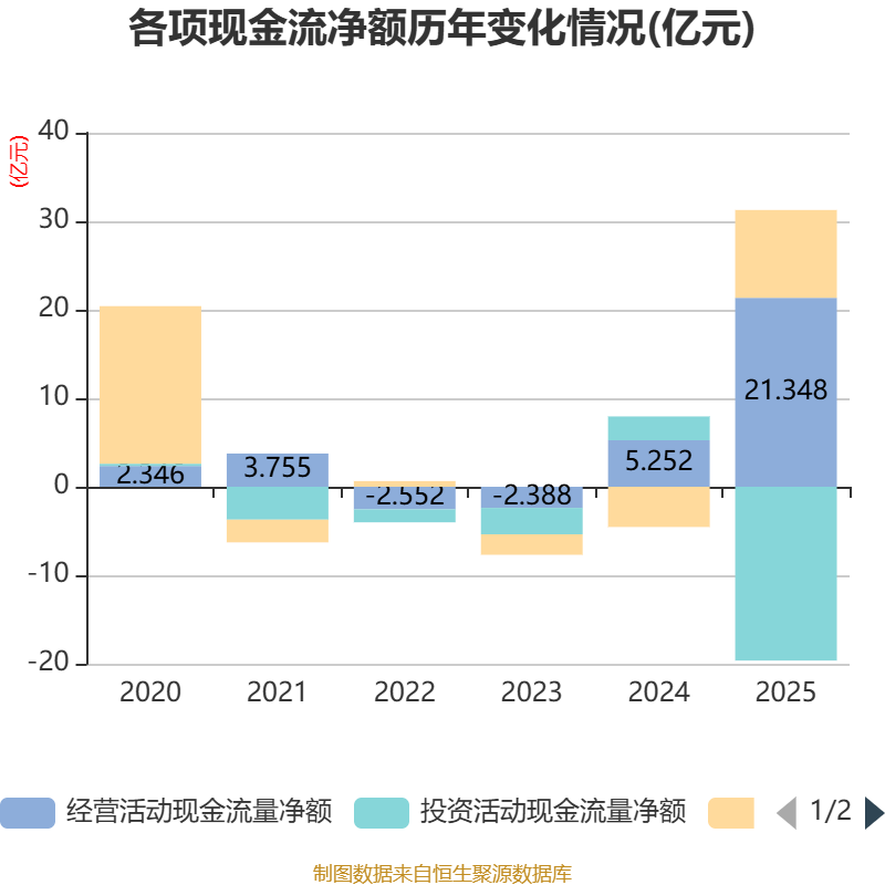 截至2025年,公司经营活动现金流净额为21.35亿元,同比增长306.46%;筹资活动现金流净额9.92亿元,同比增加14.47亿元;投资活动现金流净额-19.64亿元,上年同期为2.69亿元。