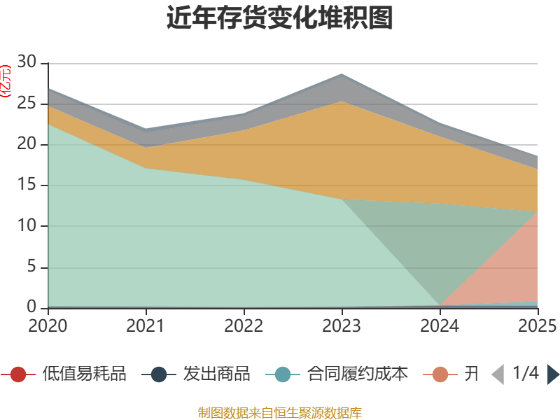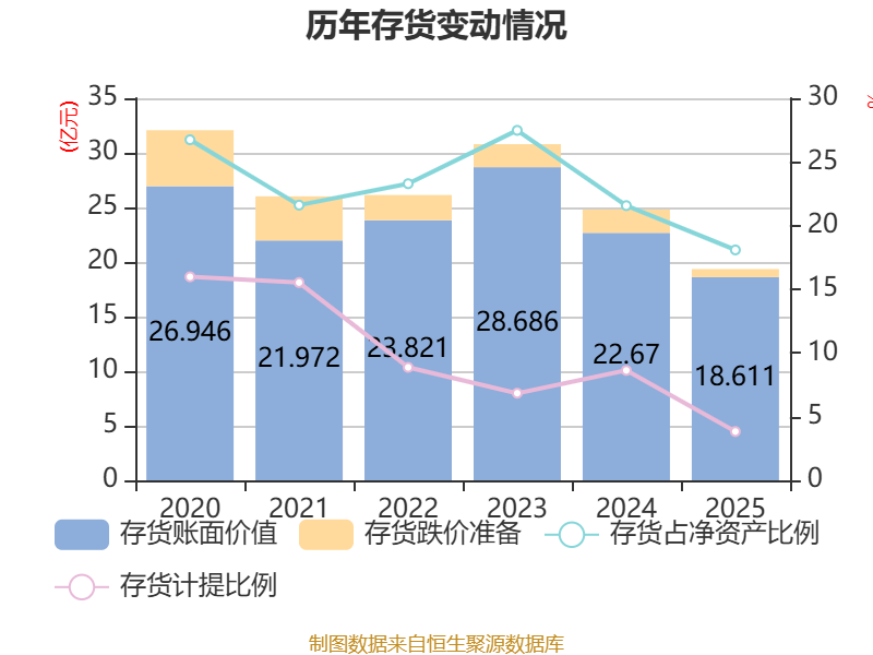 从存货变动来看,截至2025年末,公司存货账面价值为18.61亿元,占净资产的18.09%,较上年末减少4.06亿元。其中,存货跌价准备为7408.31万元,计提比例为3.83%。
