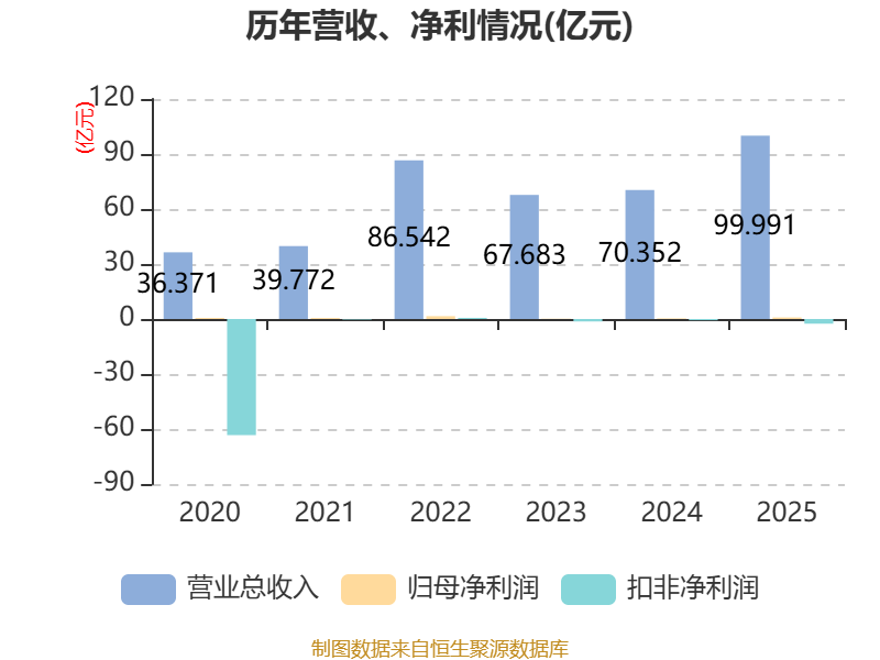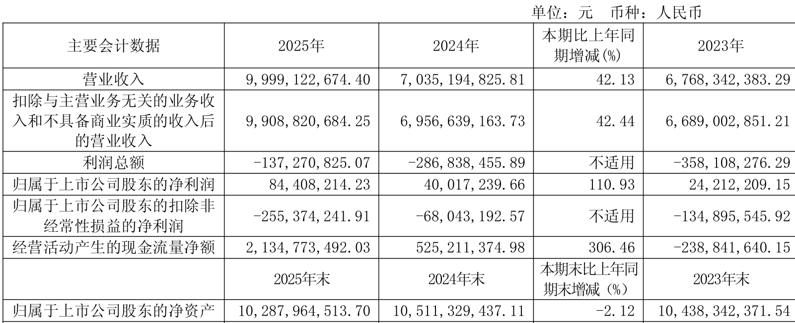 中证智能财讯千里科技(601777)4月4日披露2025年年度报告。2025年,公司实现营业总收入99.99亿元,同比增长42.13%;归母净利润8440.82万元,同比增长110.93%;扣非净利润亏损2.55亿元,上年同期亏损6804.32万元;经营活动产生的现金流量净额为21.35亿元,同比增长306.46%;报告期内,千里科技基本每股收益为0.02元,加权平均净资产收益率为0.80%。