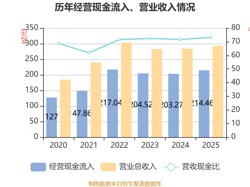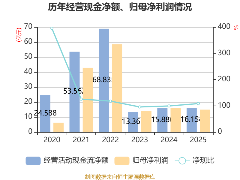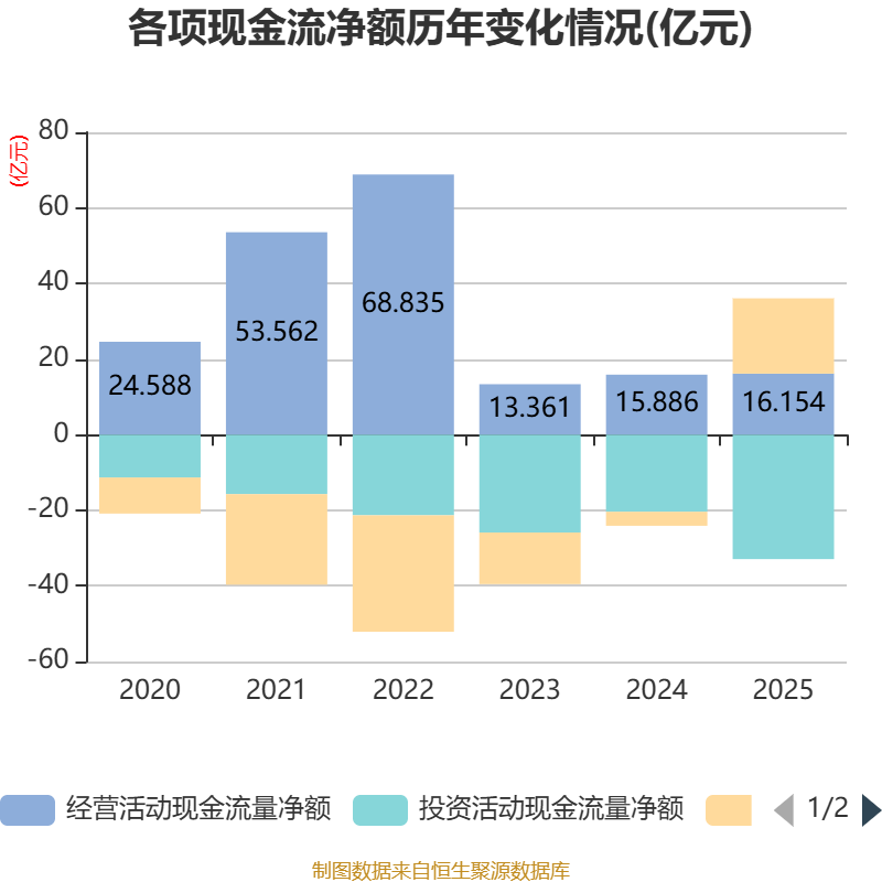 截至2025年,公司经营活动现金流净额为16.15亿元,同比增长1.68%;筹资活动现金流净额19.92亿元,同比增加23.63亿元;投资活动现金流净额-32.92亿元,上年同期为-20.39亿元。