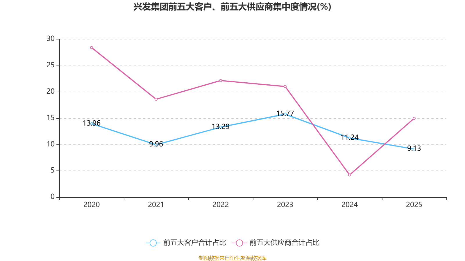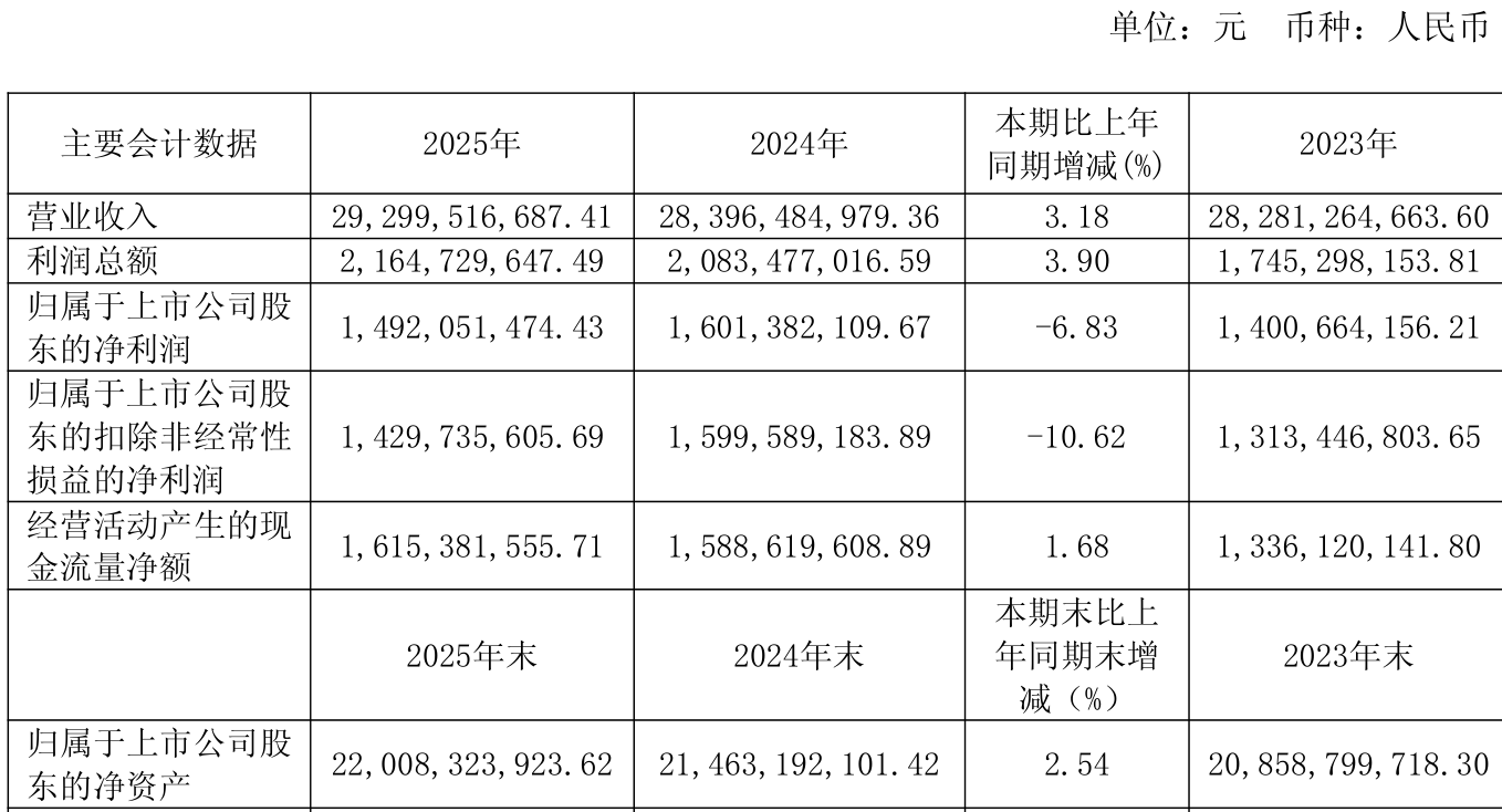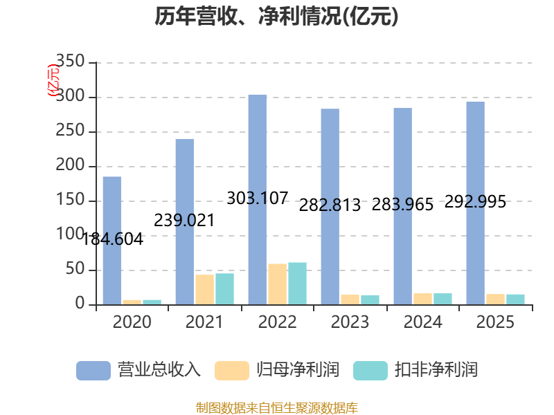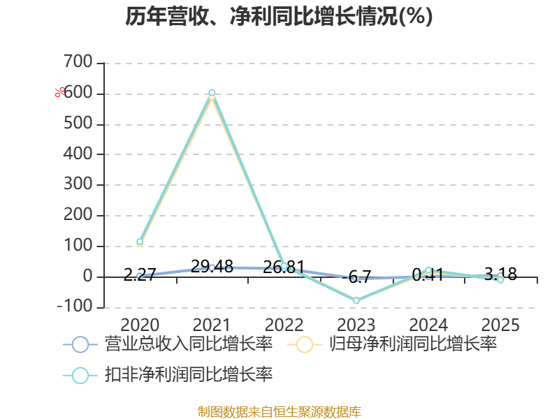 中证智能财讯兴发集团(600141)4月4日披露2025年年度报告。2025年,公司实现营业总收入293亿元,同比增长3.18%;归母净利润14.92亿元,同比下降6.83%;扣非净利润14.3亿元,同比下降10.62%;经营活动产生的现金流量净额为16.15亿元,同比增长1.68%;报告期内,兴发集团基本每股收益为1.35元,加权平均净资产收益率为6.84%。公司2025年度分配预案为:拟向全体股东每10股派现5元(含税)。