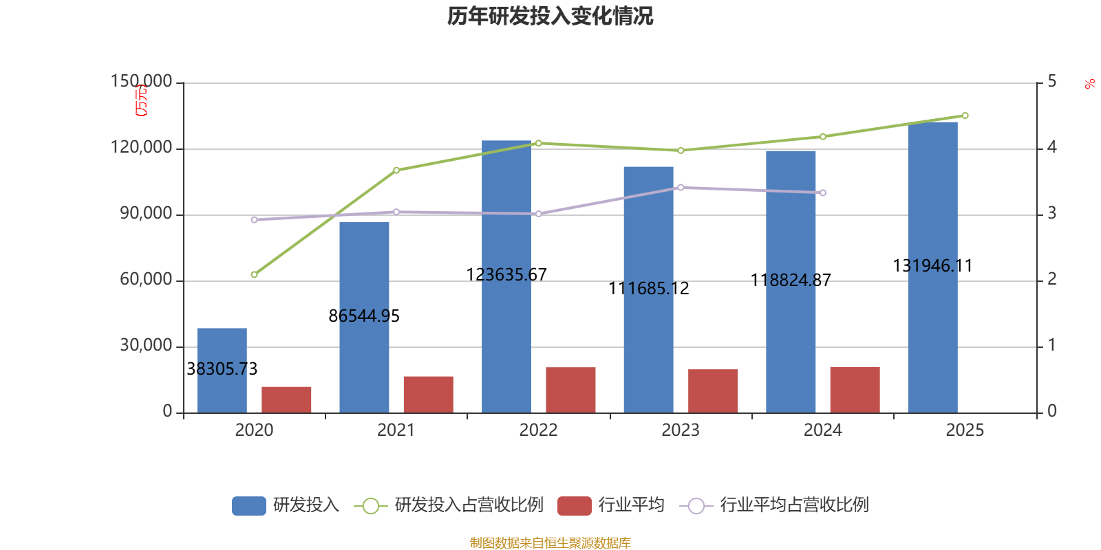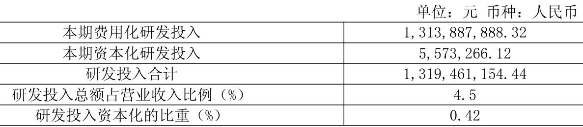 2025年全年,公司研发投入金额为13.19亿元,同比增长11.04%;研发投入占营业收入比例为4.5%,相比上年同期上升0.32个百分点。此外,公司全年研发投入资本化率为0.42%。