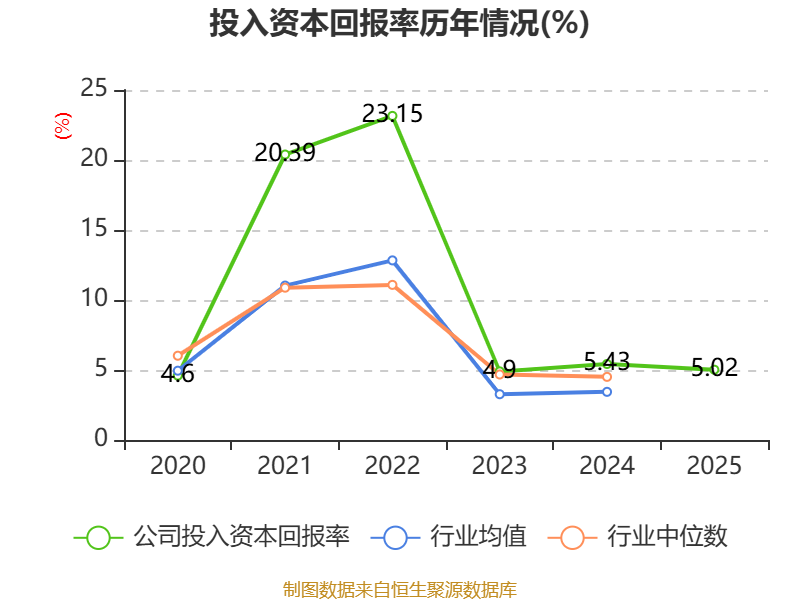 数据显示,2025年公司加权平均净资产收益率为6.84%,较上年同期下降0.75个百分点。公司2025年投入资本回报率为5.02%,较上年同期下降0.41个百分点。
