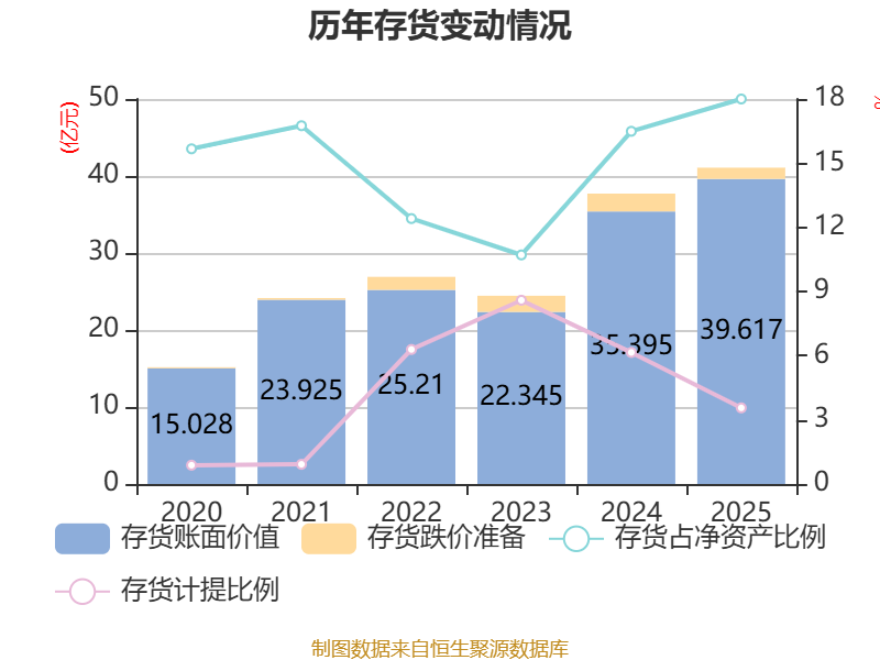 从存货变动来看,截至2025年末,公司存货账面价值为39.62亿元,占净资产的18%,较上年末增加4.22亿元。其中,存货跌价准备为1.46亿元,计提比例为3.56%。