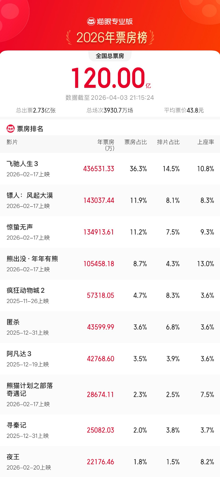 上证报中国证券网讯(记者杨翔菲)据猫眼专业版数据,截至4月3日21时15分,2026年年度电影市场总票房(含预售)已突破120亿元。《飞驰人生3》《镖人:风起大漠》《惊蛰无声》暂列年度票房榜前三位。
