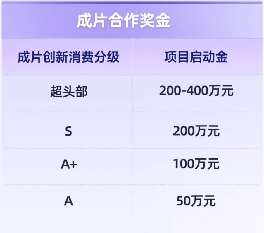 该活动从4月2日开始,活动对象为未上线的成片和未开发成片的剧本。其中,成片合作奖金最高项目启动金200万元-400万元,剧本完稿奖金最高3万元。
