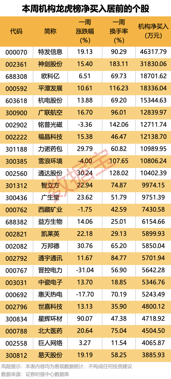 龙虎榜数据显示,本周机构专用席位共现身124股龙虎榜,净买入60股,净卖出64股。其中,特发信息、神剑股份等11股机构净买入金额均超1亿元。