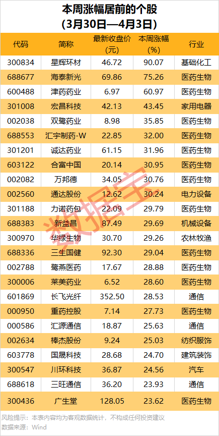 据证券时报·数据宝统计,本周超1000股上涨,37股涨幅在20%及以上。其中,涨幅最大的是星辉环材,本周累计上涨90.07%;海泰新光本周累计涨75.26%,津药药业和宏昌科技涨幅均在40%以上。