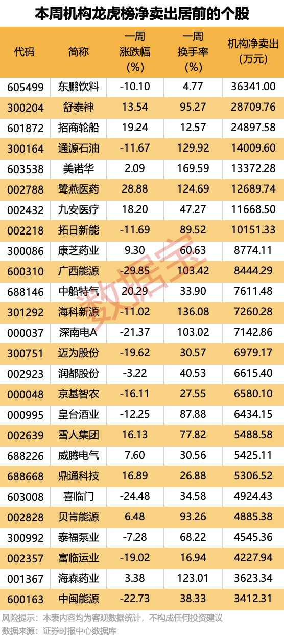 一周机构累计净卖出的个股中,8股金额均超1亿元,其中净卖出金额最多的是东鹏饮料,达3.63亿元。该股本周累计下跌10.10%,本周有1次上榜龙虎榜,买卖居前席位中机构席位合计净卖出3.63亿元;同时上榜的还有沪股通专用席位,净卖出3.66亿元。