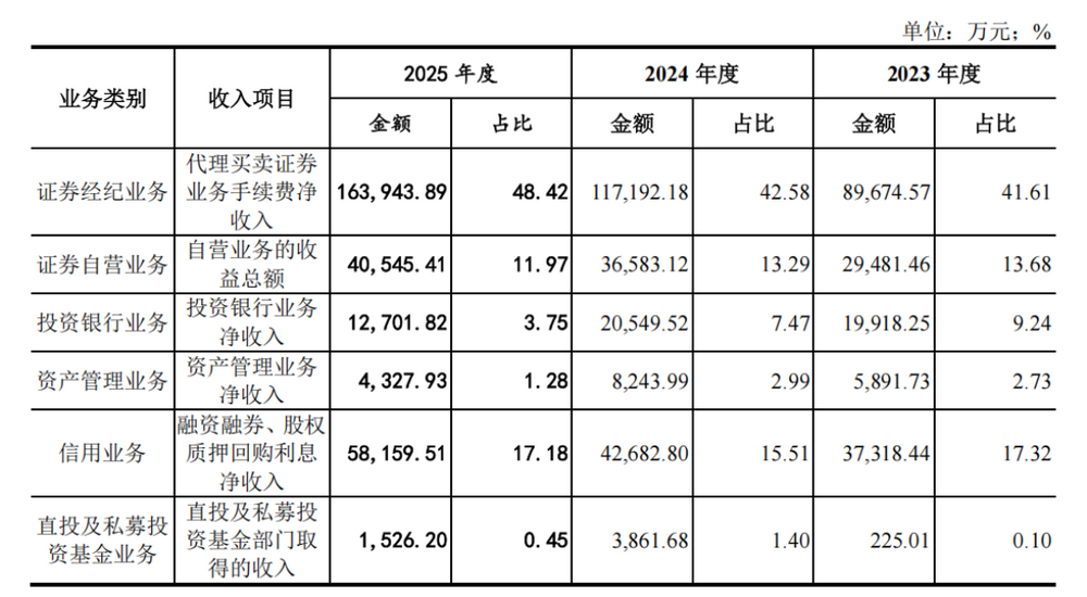 不过,从主营业务板块来看,业务表现分化。证券经纪业务是东莞证券目前规模最大、收入利润贡献最高的业务。2025年,东莞证券经纪业务手续费净收入16.39亿元,同比增速达39.85%。2023年度、2024年度、2025年度,公司证券经纪业务产生的代理买卖证券业务手续费净收入分别为8.97亿元、11.72亿元及16.39亿元,占公司同期营业收入的比例分别为41.61%、42.58%及48.42%。