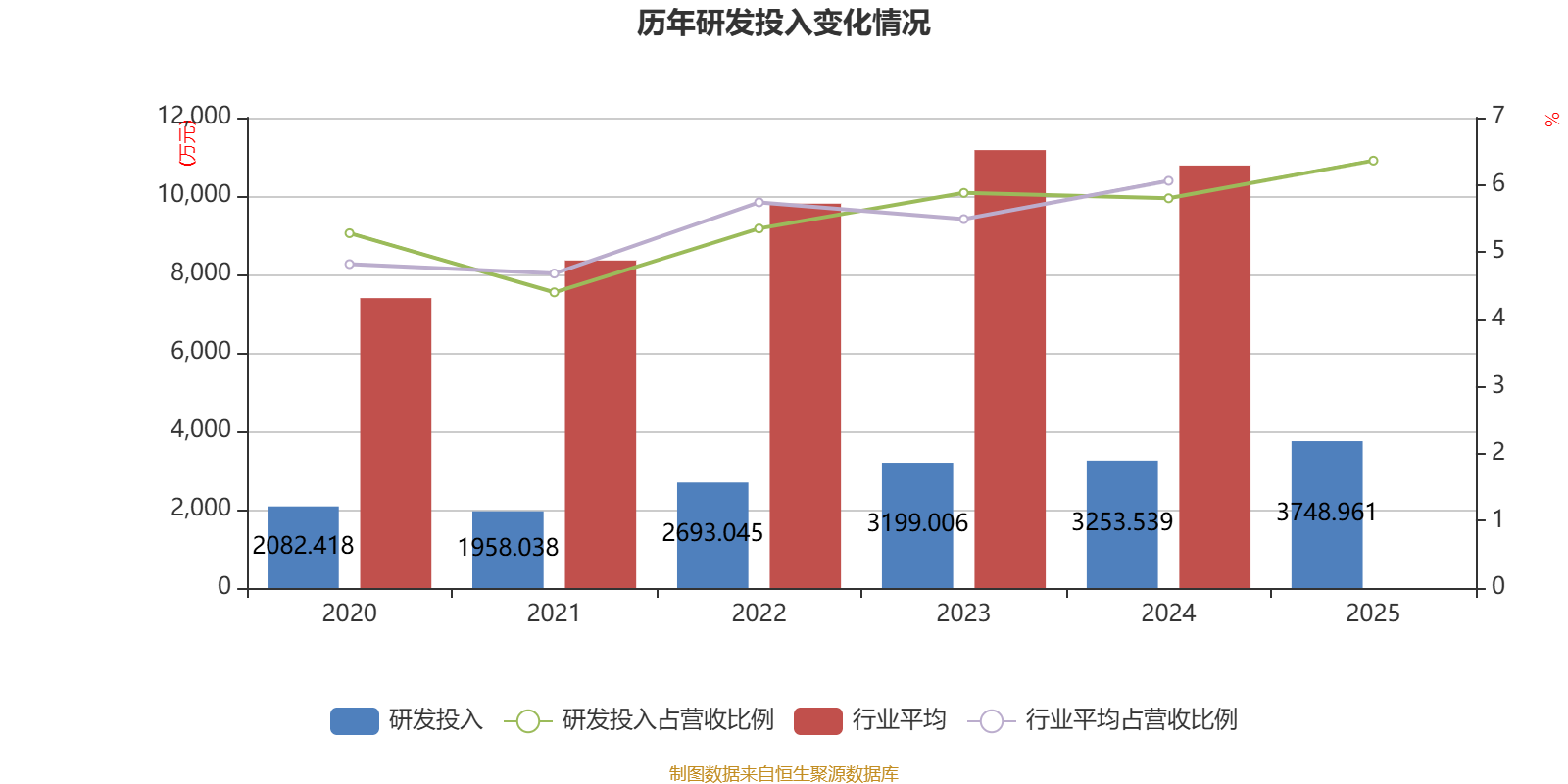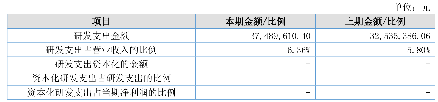 2025年全年,公司研发投入金额为3748.96万元,同比增长15.23%;研发投入占营业收入比例为6.36%,相比上年同期上升0.56个百分点。