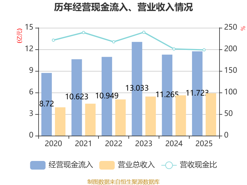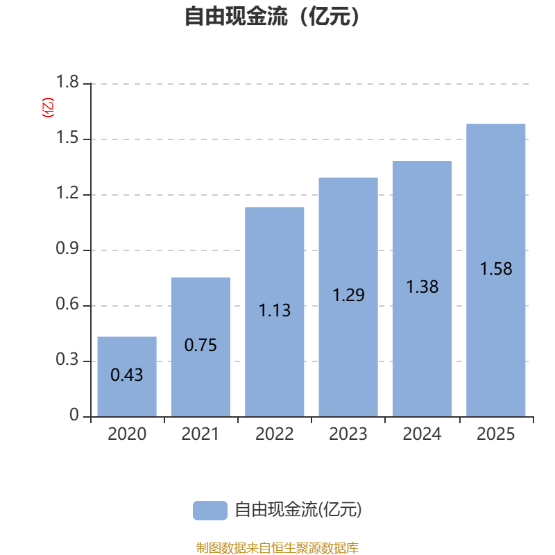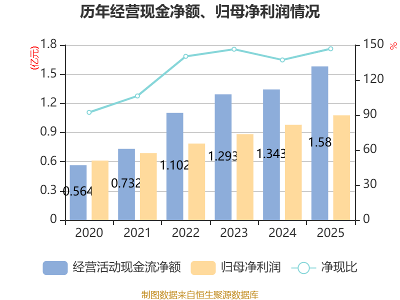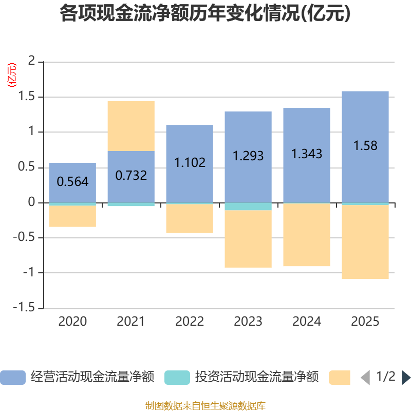 截至2025年,公司经营活动现金流净额为1.58亿元,同比增长17.62%;筹资活动现金流净额-1.05亿元,同比减少1595.82万元;投资活动现金流净额-357.64万元,上年同期为-141.18万元。